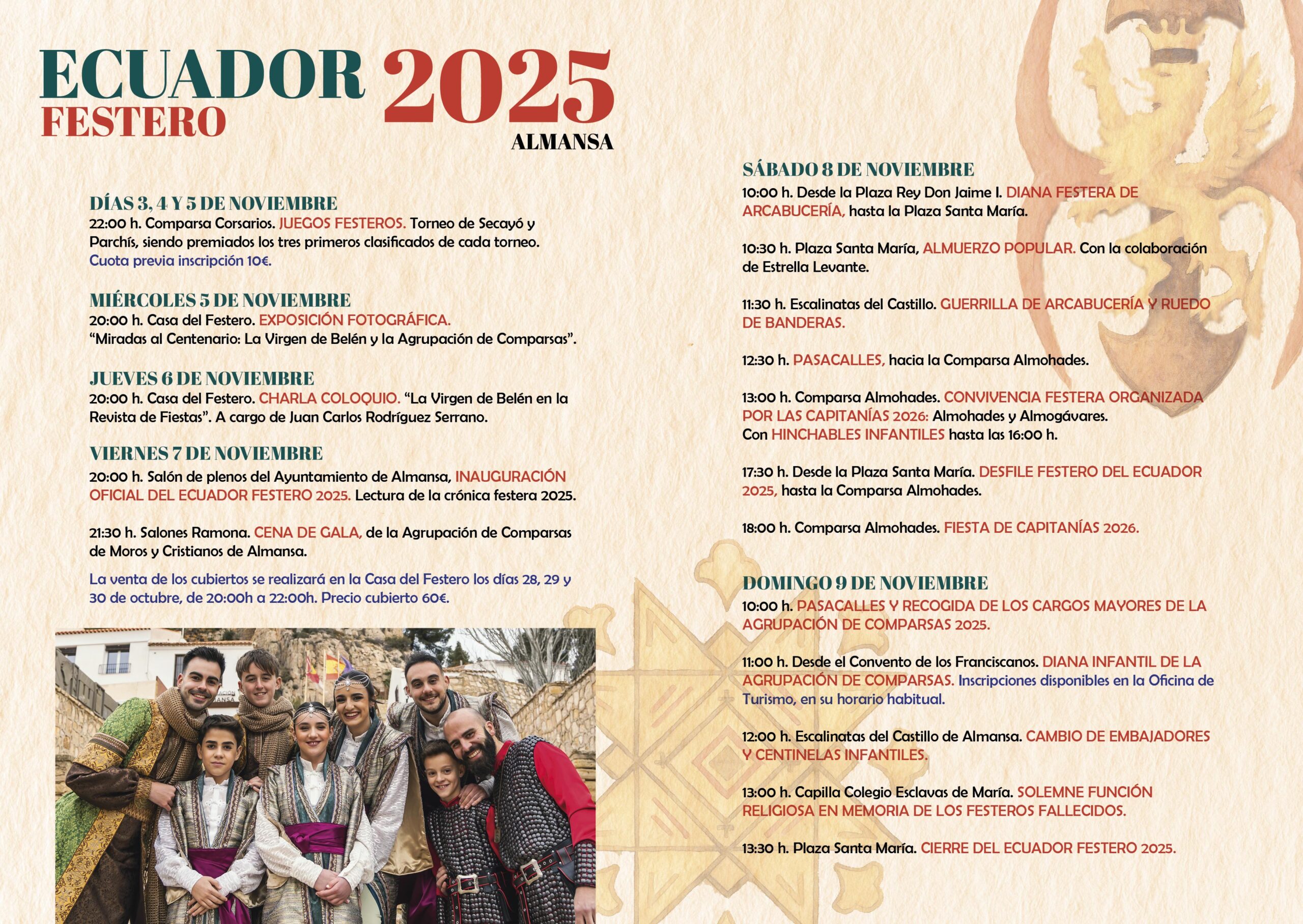 El Ecuador Festero se celebra a principios del mes de noviembre cada año en Almansa, inundando las calles con un ambiente festivo durante todo el fin de semana. Este evento marca el punto intermedio entre las Fiestas pasadas y las próximas, ya que recuerda que han transcurrido seis meses desde las últimas Fiestas de Moros y Cristianos. La Agrupación de Comparsas es la encargada de organizar esta celebración, que incluye una gran variedad de actividades como exposiciones, charlas o conferencias, lectura de la memoria anual, una cena de gala, cambio de embajadores infantiles, dianas, eventos religiosos, entre otros.